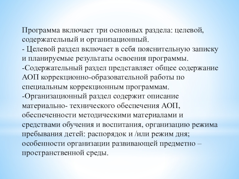 -Содержательный раздел представляет общее содержание АОП коррекционно-образовательной работы по специальным коррекционным программам.