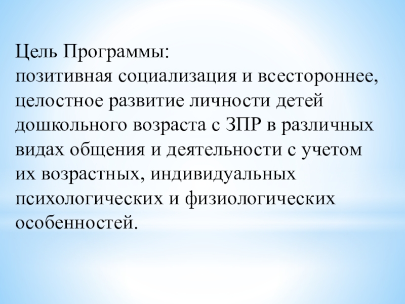 Цель Программы: позитивная социализация и всестороннее, целостное развитие личности детей дошкольного возраста с ЗПР в различных видах