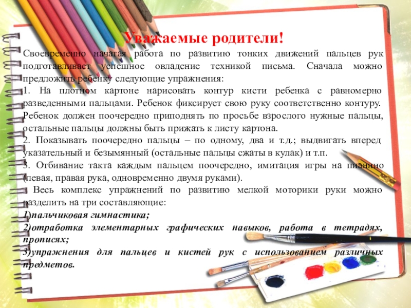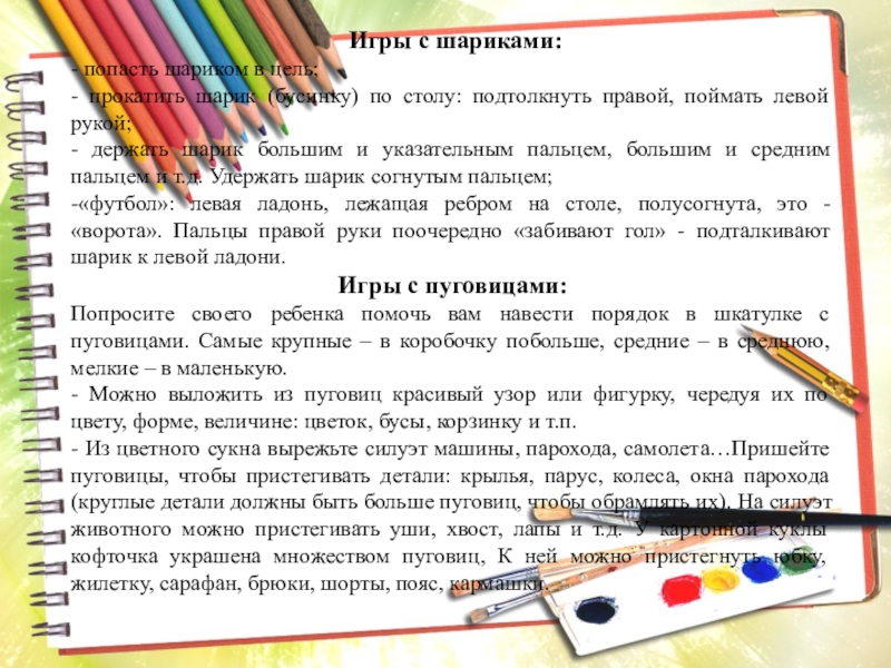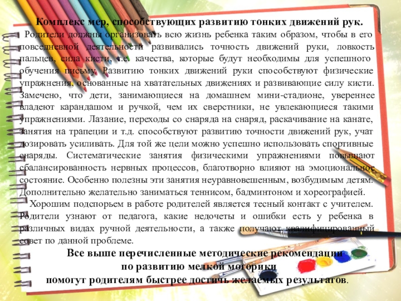 Слайд 15 Комплекс мер, способствующих развитию тонких движений рук.