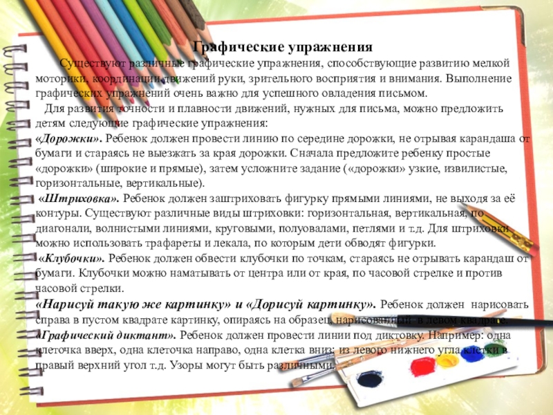 движений руки, зрительного восприятия и внимания. Выполнение графических упражнений очень важно для успешного овладения письмом.