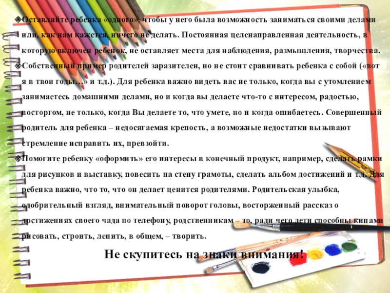 Слайд 3Оставляйте ребенка «одного», чтобы у него была возможность заниматься своими делами