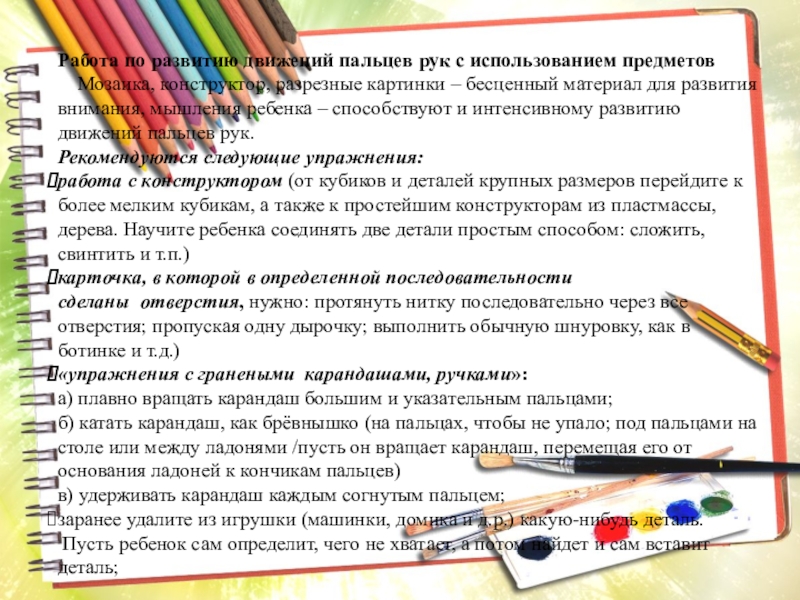 Слайд 11Работа по развитию движений пальцев рук с использованием предметов