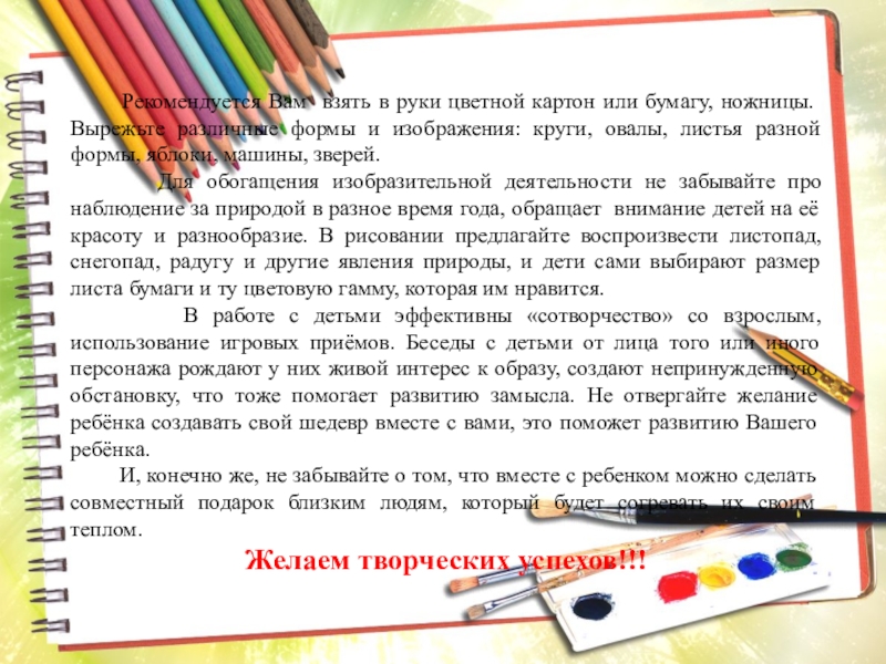 В работе с детьми эффективны «сотворчество» со взрослым, использование игровых приёмов. Беседы с детьми от лица того или иного персонажа рождают у них живой интерес к образу, создают непринужденную обстановку, что тоже помогает развитию замысла. Не отвергайте желание ребёнка создавать свой шедевр вместе с вами, это поможет развитию Вашего ребёнка.