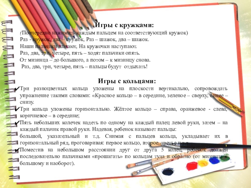 3)упражнения для пальцев и кистей рук с использованием различных предметов.