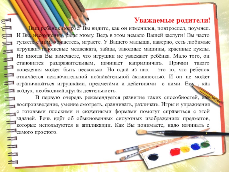 он изменился, повзрослел, поумнел. И Вы, несомненно, рады этому. Ведь в этом немало Вашей заслуги! Вы часто гуляете с ним, общаетесь, играете. У Вашего малыша, наверно, есть любимые игрушки: плюшевые медвежата, зайцы, заводные машины, красивые куклы. Но иногда Вы замечаете, что игрушки не увлекают ребёнка. Мало того, он становится раздражительным, начинает капризничать. Причин такого поведения может быть несколько. Но одна из них – это то, что ребёнок отличается исключительной познавательной активностью. И он не может ограничиваться игрушками, предметами и действиями с ними. Ему , как воздух, необходима другая деятельность.