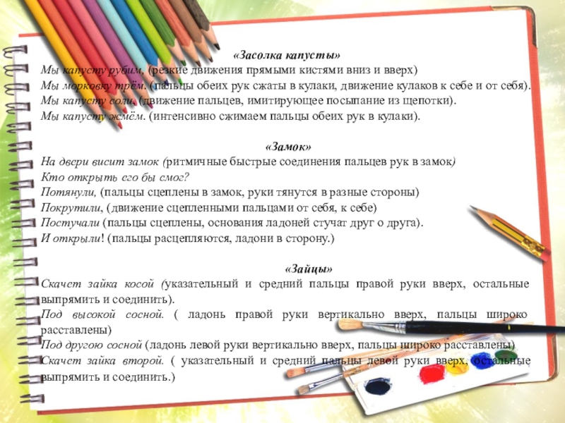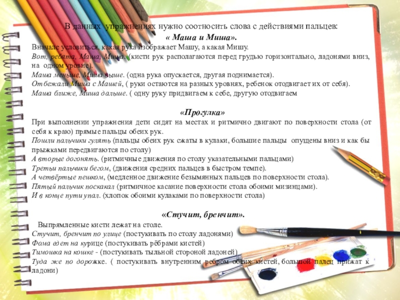 Слайд 9В данных упражнениях нужно соотносить слова с действиями пальцев: