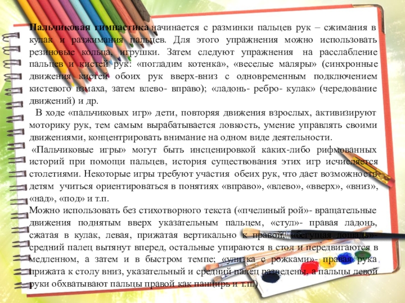 Слайд 8Пальчиковая гимнастика начинается с разминки пальцев рук – сжимания в кулак и