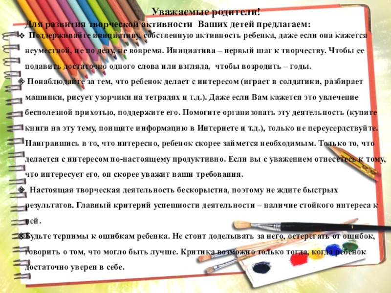 Помогите ребенку «оформить» его интересы в конечный продукт, например, сделать рамки для рисунков и выставку, повесить на стену грамоты, сделать альбом достижений и т.д. Для ребенка важно, что то, что он делает ценится родителями. Родительская улыбка, одобрительный взгляд, внимательный поворот головы, восторженный рассказ о достижениях своего чада по телефону, родственникам – то, ради чего дети способны кипами рисовать, строить, лепить, в общем, – творить.