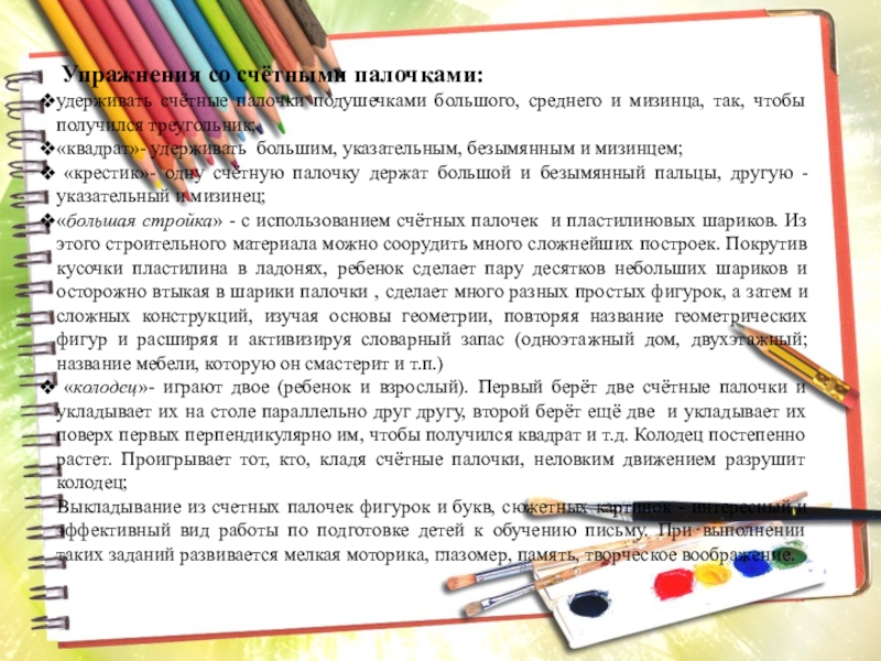 удерживать счётные палочки подушечками большого, среднего и мизинца,
