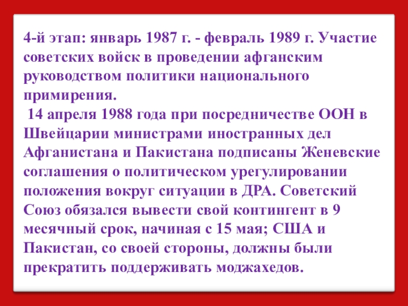 Слайд 114-й этап: январь 1987 г. - февраль 1989 г. Участие советских войск в проведении