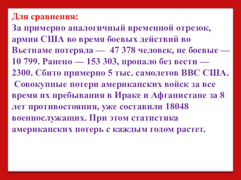 действий во Вьетнаме потеряла — 47 378 человек, не боевые — 10 799. Ранено — 153 303, пропало без вести — 2300. Сбито примерно 5 тыс. самолетов ВВС США.