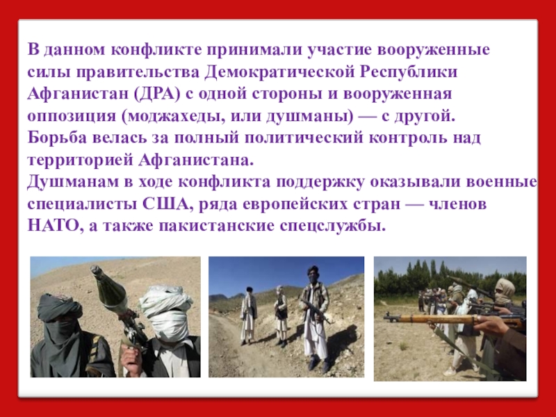 Слайд 4В данном конфликте принимали участие вооруженные силы правительства Демократической Республики Афганистан