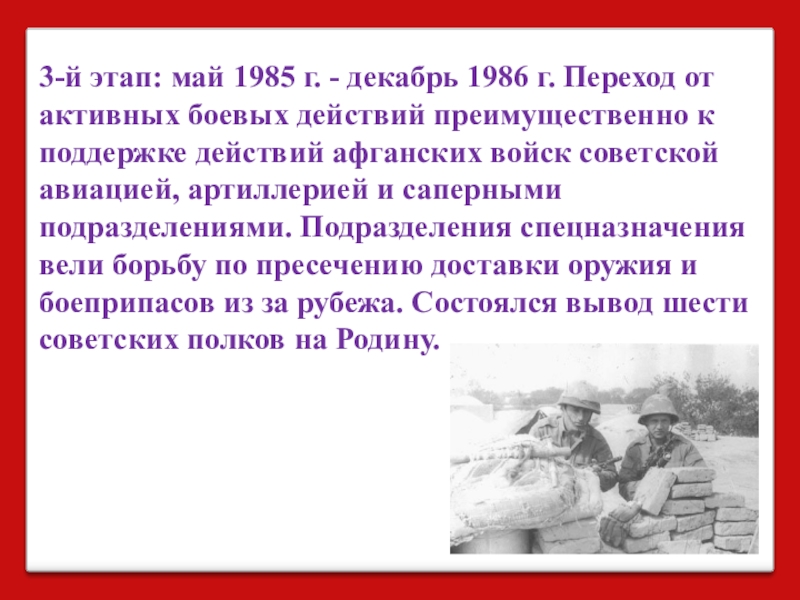 Слайд 103-й этап: май 1985 г. - декабрь 1986 г. Переход от активных боевых действий