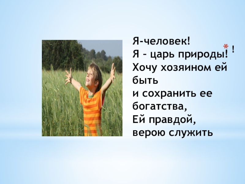 !Я-человек!  Я – царь природы! Хочу хозяином ей быть и сохранить ее богатства, Ей правдой, верою