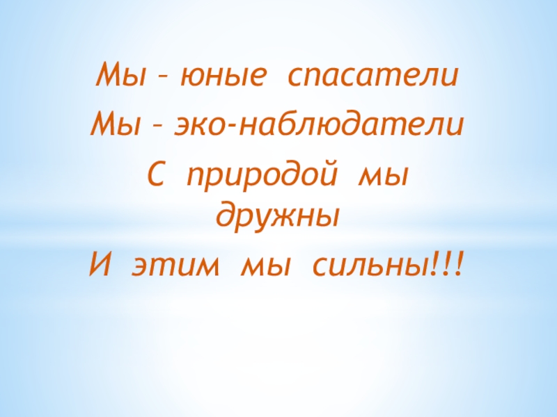 Мы – юные спасателиМы – эко-наблюдателиС природой мы дружныИ этим мы сильны!!!