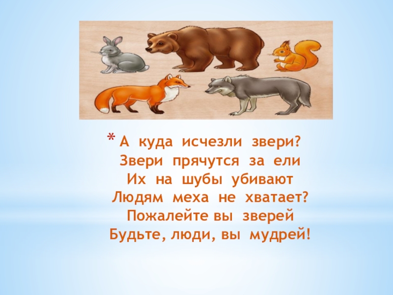 Слайд 8А куда исчезли звери? Звери прячутся за ели Их на шубы убивают Людям меха