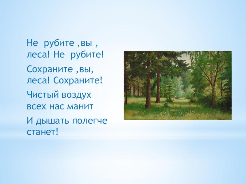 Не рубите ,вы , леса! Не рубите!Сохраните ,вы, леса! Сохраните!Чистый воздух всех нас манитИ дышать полегче станет!
