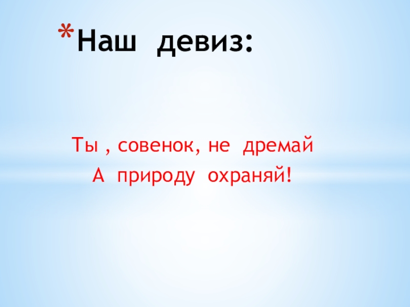 Ты , совенок, не дремайА природу охраняй!Наш девиз: