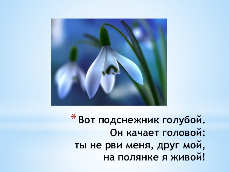 Слайд 10Вот подснежник голубой. Он качает головой: ты не рви меня, друг мой, на