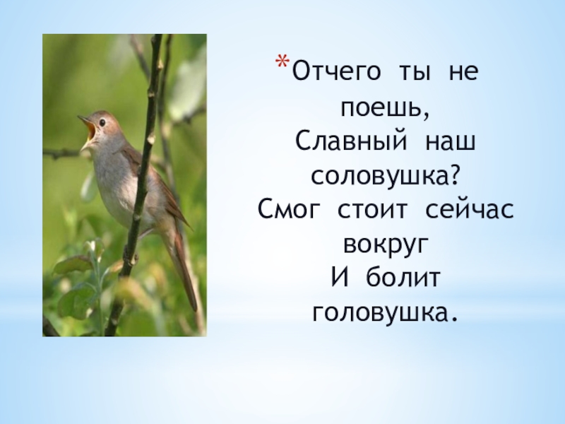 Слайд 7Отчего ты не поешь, Славный наш соловушка? Смог стоит сейчас вокруг И болит головушка.