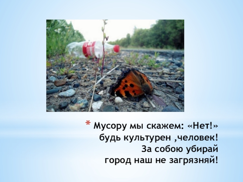 Слайд 11Мусору мы скажем: «Нет!» будь культурен ,человек! За собою убирай город наш не загрязняй!