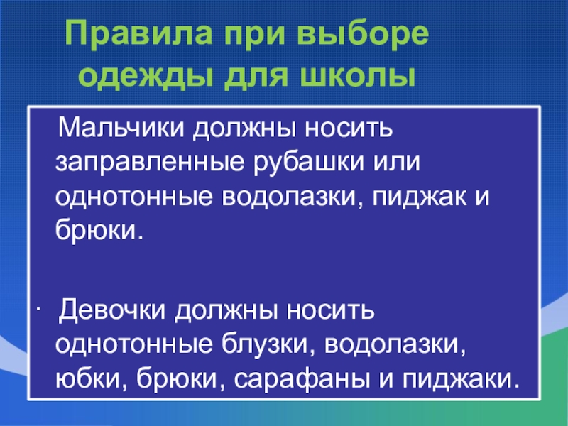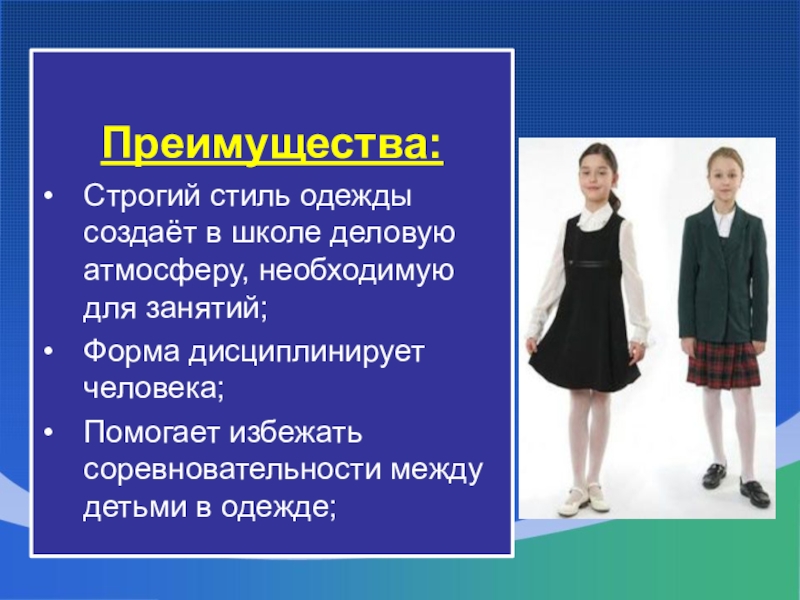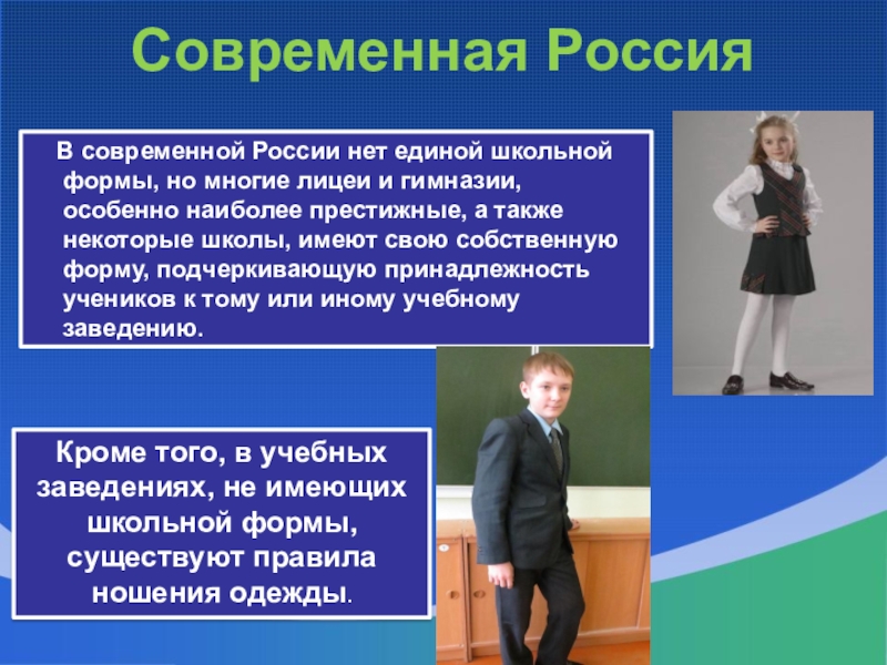 Кроме того, в учебных заведениях, не имеющих школьной формы, существуют правила ношения одежды.
