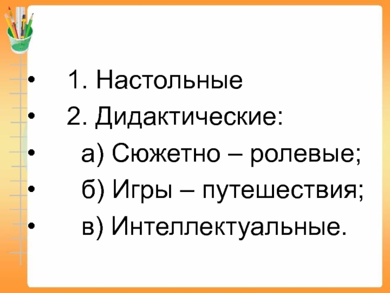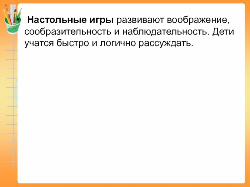 Слайд 15 Настольные игры развивают воображение, сообразительность и наблюдательность. Дети учатся быстро