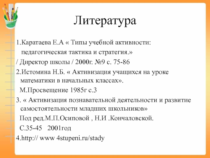 2.Истомина Н.Б. « Активизация учащихся на уроке математики в начальных классах».
