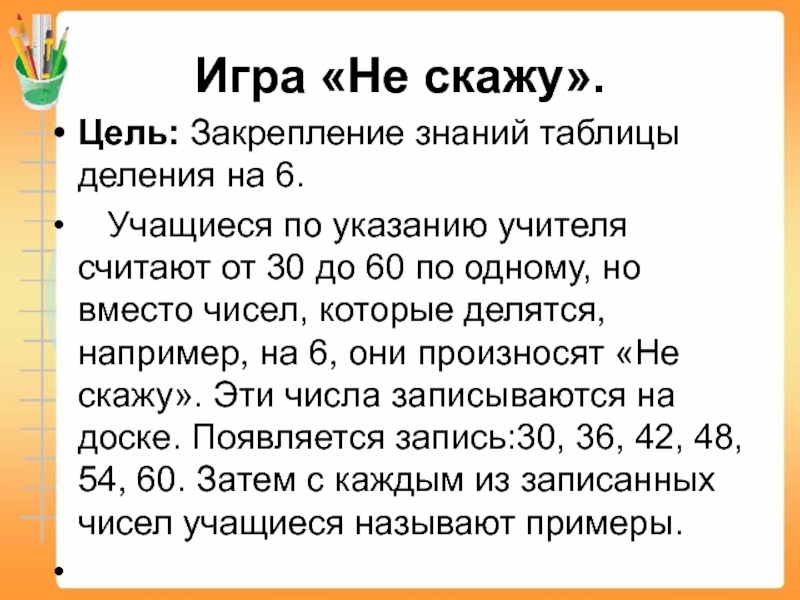 Учащиеся по указанию учителя считают от 30 до 60 по одному, но вместо чисел, которые делятся, например, на 6, они произносят «Не скажу». Эти числа записываются на доске. Появляется запись:30, 36, 42, 48, 54, 60. Затем с каждым из записанных чисел учащиеся называют примеры.
