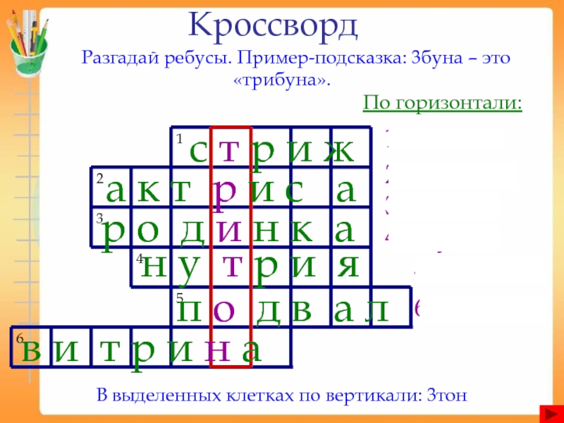 Разгадай ребусы. Пример-подсказка: 3буна – это «трибуна».