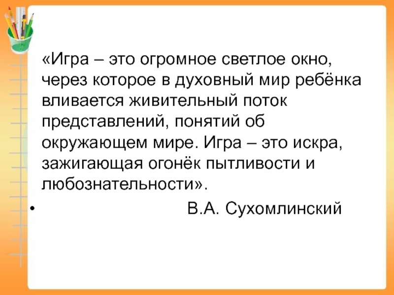 Слайд 13 «Игра – это огромное светлое окно, через которое в