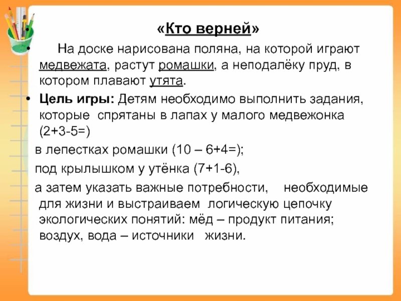 Большинство дидактических игр заключают в себе вопрос, задание, призыв к действию, например: