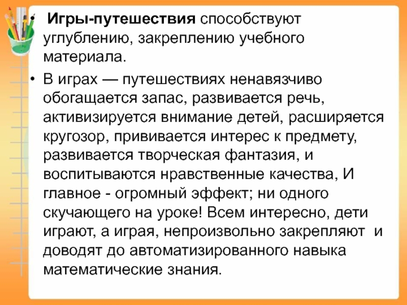 Слайд 39 Игры-путешествия способствуют углублению, закреплению учебного материала.