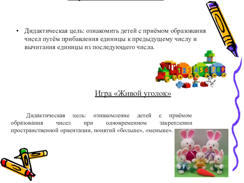 Дидактическая цель: ознакомление детей с приёмом образования чисел при одновременном закреплении пространственной ориентации, понятий «больше», «меньше».