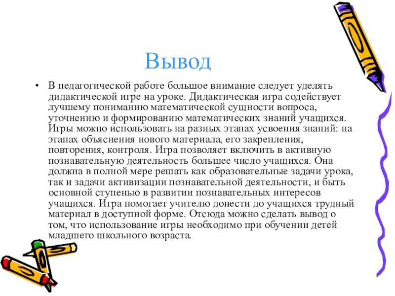 Цель исследования: выявить, научно обосновать педагогические условия активизации познавательной деятельности младших школьников на уроках математики с помощью дидактической игры.