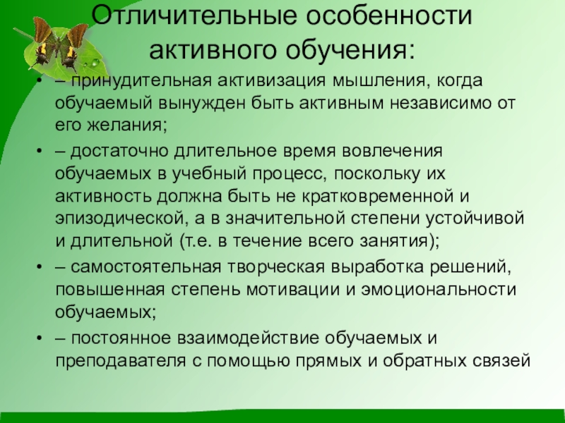 Отличительные особенности активного обучения: – принудительная активизация мышления, когда обучаемый вынужден быть активным независимо от его желания;–