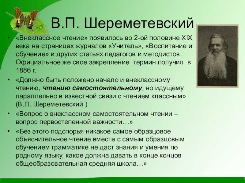В.П. Шереметевский «Внеклассное чтение» появилось во 2-ой половине XIX века на страницах журналов «Учитель», «Воспитание и обучение»