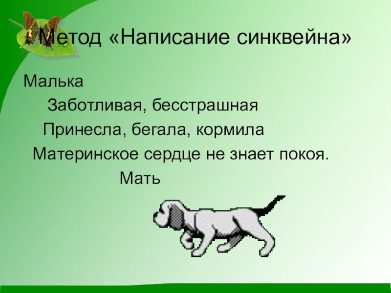 Метод «Написание синквейна»Малька   Заботливая, бесстрашная  Принесла, бегала, кормила Материнское сердце не знает покоя.