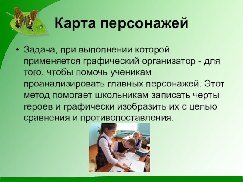Карта персонажейЗадача, при выполнении которой применяется графический организатор - для того, чтобы помочь ученикам проанализировать главных персонажей.