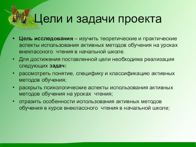Цели и задачи проекта Цель исследования – изучить теоретические и практические аспекты использования активных методов обучения на уроках внеклассного чтения в начальной школе.Для достижения поставленной цели необходима реализация следующих задач:рассмотреть понятие, специфику и классификацию активных методов