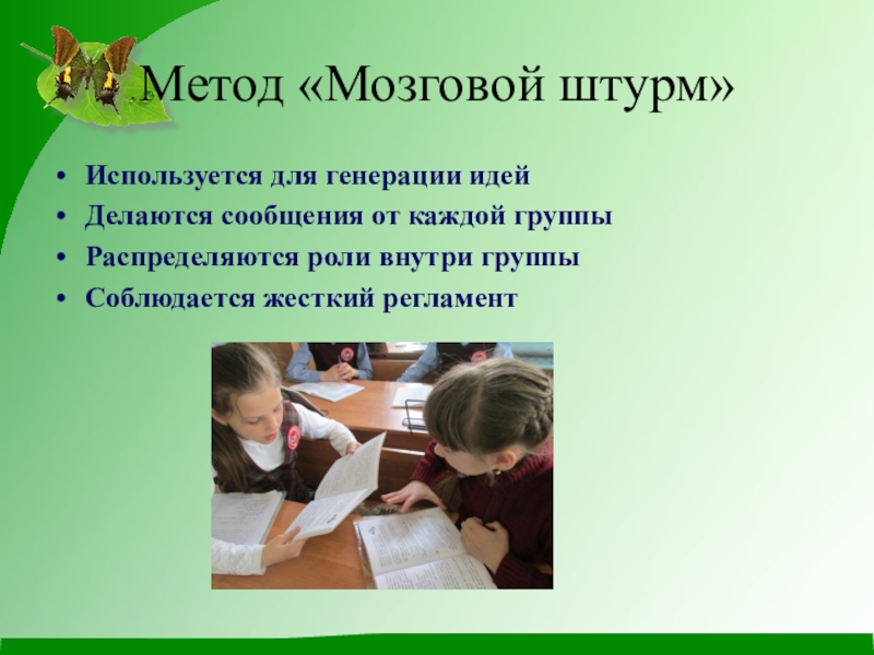 Метод «Мозговой штурм» Используется для генерации идейДелаются сообщения от каждой группыРаспределяются роли внутри группыСоблюдается жесткий регламент