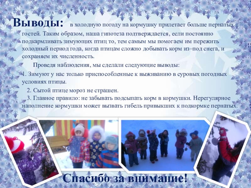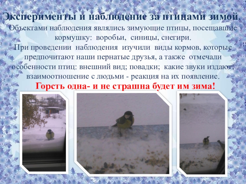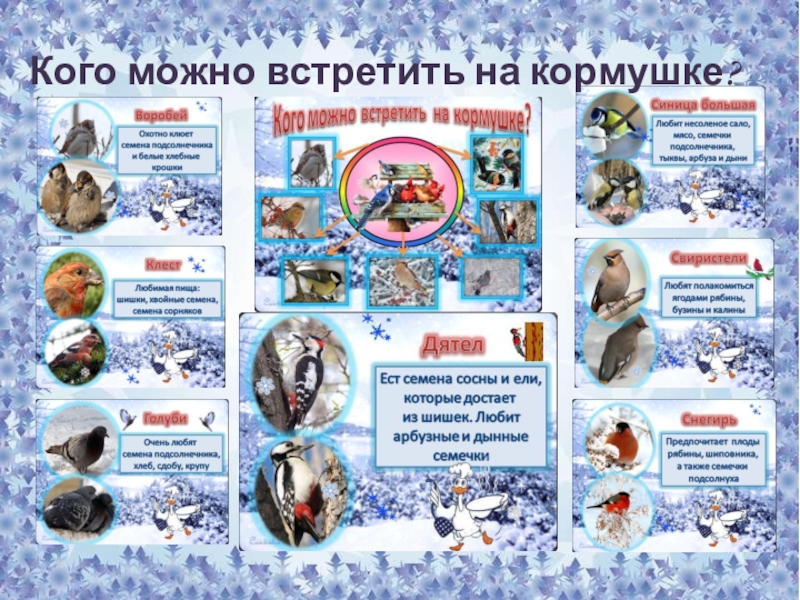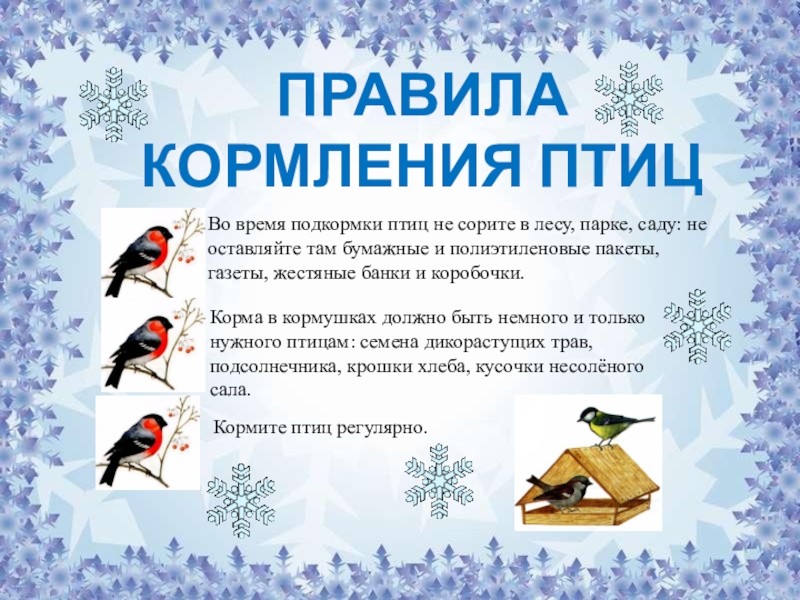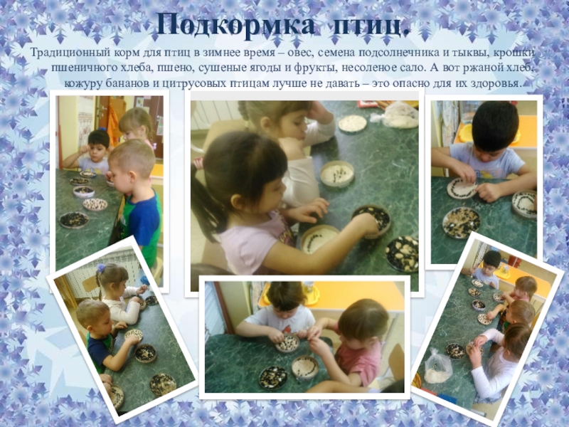 Корма в кормушках должно быть немного и только нужного птицам: семена дикорастущих трав, подсолнечника, крошки хлеба, кусочки несолёного сала.