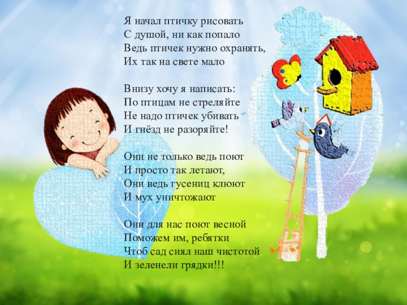 Я начал птичку рисоватьС душой, ни как попалоВедь птичек нужно охранять,Их так на свете малоВнизу хочу я