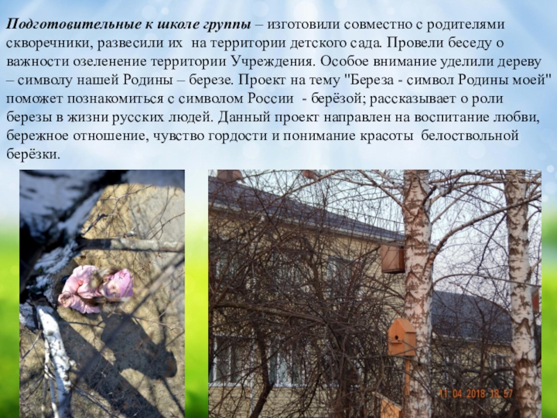 их на территории детского сада. Провели беседу о важности озеленение территории Учреждения. Особое внимание уделили дереву – символу нашей Родины – березе. Проект на тему "Береза - символ Родины моей" поможет познакомиться с символом России  - берёзой; рассказывает о роли березы в жизни русских людей. Данный проект направлен на воспитание любви, бережное отношение, чувство гордости и понимание красоты  белоствольной  берёзки.