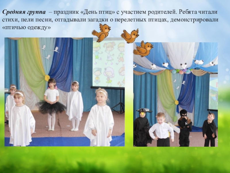 Слайд 8Средняя группа – праздник «День птиц» с участием родителей. Ребята читали