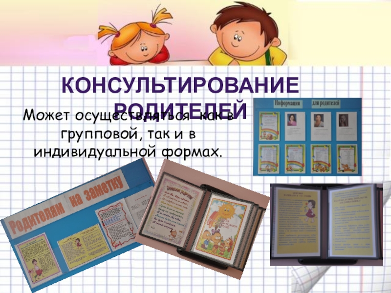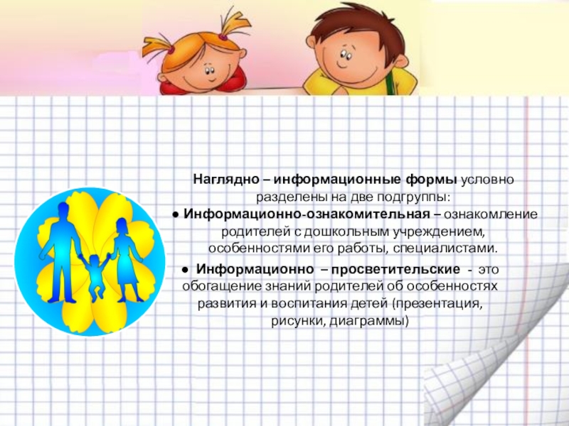 ● Информационно – просветительские - это обогащение знаний родителей об особенностях развития и воспитания детей (презентация, рисунки, диаграммы)