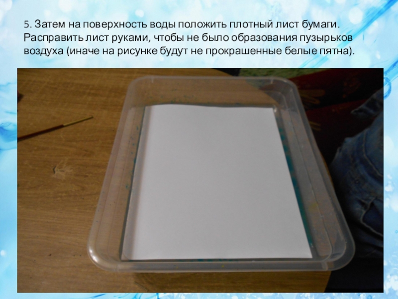 Слайд 105. Затем на поверхность воды положить плотный лист бумаги. Расправить лист