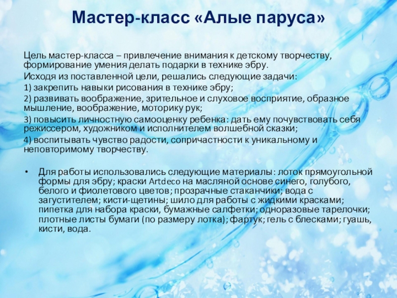 Я предлагаю ознакомиться с техникой эбру на примере конкретного мастер-класса «Алые паруса».