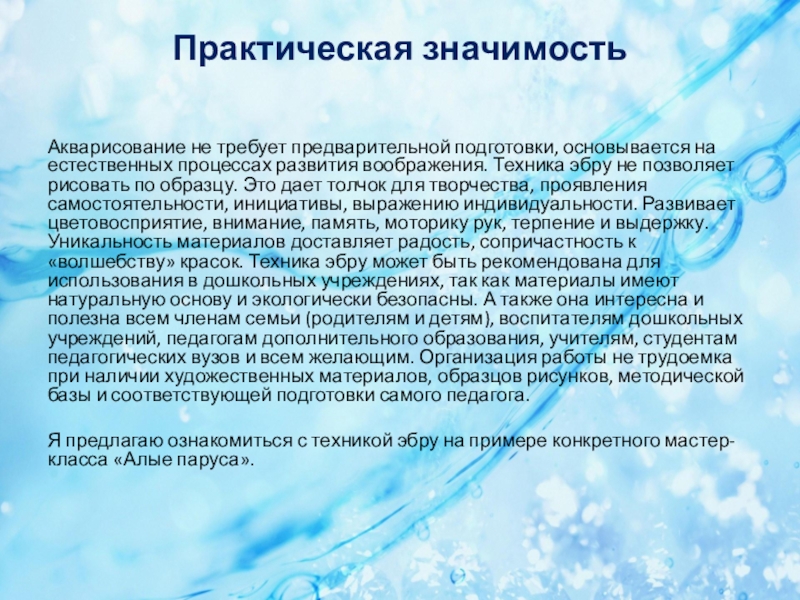 воображения. Техника эбру не позволяет рисовать по образцу. Это дает толчок для творчества, проявления самостоятельности, инициативы, выражению индивидуальности. Развивает цветовосприятие, внимание, память, моторику рук, терпение и выдержку. Уникальность материалов доставляет радость, сопричастность к «волшебству» красок. Техника эбру может быть рекомендована для использования в дошкольных учреждениях, так как материалы имеют натуральную основу и экологически безопасны. А также она интересна и полезна всем членам семьи (родителям и детям), воспитателям дошкольных учреждений, педагогам дополнительного образования, учителям, студентам педагогических вузов и всем желающим. Организация работы не трудоемка при наличии художественных материалов, образцов рисунков, методической базы и соответствующей подготовки самого педагога.