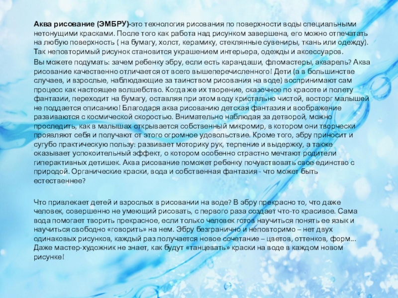 Слайд 2Аква рисование (ЭМБРУ)-это технология рисования по поверхности воды специальными нетонущими красками.